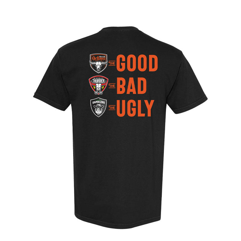 Team loyalty never looked this bold. The Good, Bad, Ugly tee is a playful jab at rivalries, ranking the Kansas City Outlaws as The Good, while calling out their top opponents with some not-so-subtle shade. The front sports a clean Kansas City Outlaws logo, while the back says exactly what you’re thinking—with team badges and stacked typography that hits hard. Because if you're riding with the Outlaws, you already know who's who.